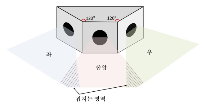 본 연구에서 사용된 다중 카메라 기반 파노라마 영상 정합 시스템은 그림 2와 같이 좌·중앙·우의 세 대의 광시야 카메라로 구성된다. 약 60°씩 겹치는 형태로 배치하여 전체 약 180°에 이르는 시야를 확보하도록 설계하였다.