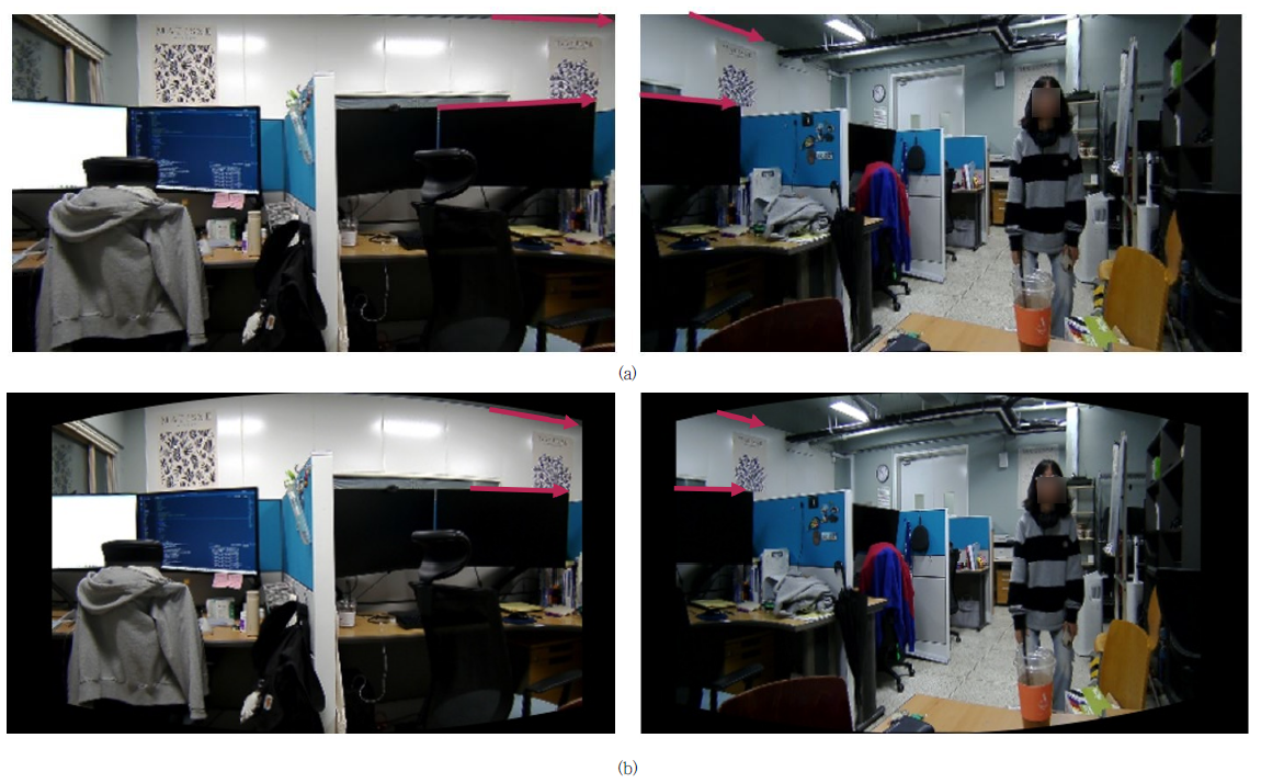 수 있다. 그림 3(a)에서 보이는 것처럼, 원본 영상에서는 서로 다른 카메라 시점으로 인해 화면 상단의 수평 구조물이 각 영상에서 상이한 기울기로 나타난다. 이러한 기울기