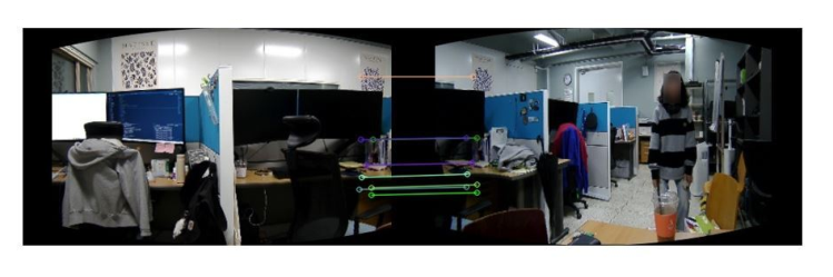 4], SuperPoint[5]를 활용하여 특징점을 추출하며 BruteForce 매칭으로 대응점을 찾는다. 이후 RANSAC[6] 알고리즘을 통한 이상점을 제거, 어파인 변환(Affine Transform)을 통한 이미지 왜곡 및 알파 블렌딩의 과정을 거쳐 자연스러운 파노라마