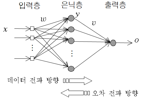 학습이란 샘플 데이터의 입력과 출력의 상호관계를 그림 1에서의 데이터 전파 방향에 따라 만족하도록 가중치 w와 v 값을 조정하는 것이다. 이 과정에서 뉴런의 출력값과 샘플 데이터의 출력값에 차이가 발생하며