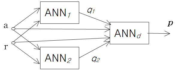 o 만을 대상으로 하는 반면에, 통합 ANN에서는 드러나지 않았던 ‘q’라는 성분을 선택하여 입력과 출력의 대상으로 정의하는 것이 분할 신경망(b)이다.