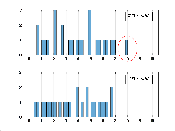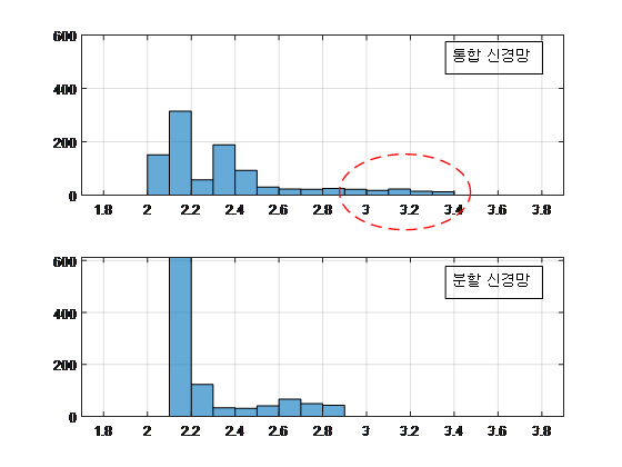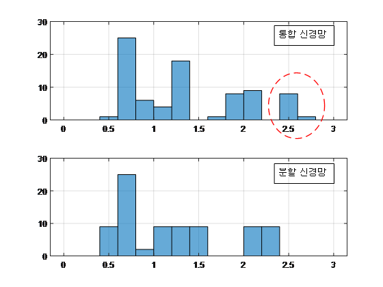 그림에서 알 수 있듯이 통합신경망에서는 2.5 이상의 오차를 다수 보이는 반면 분할 신경망에서는 모두 2.5 보다 작은 오차를 보인다. 만약 오차의