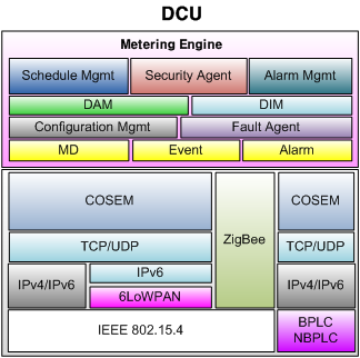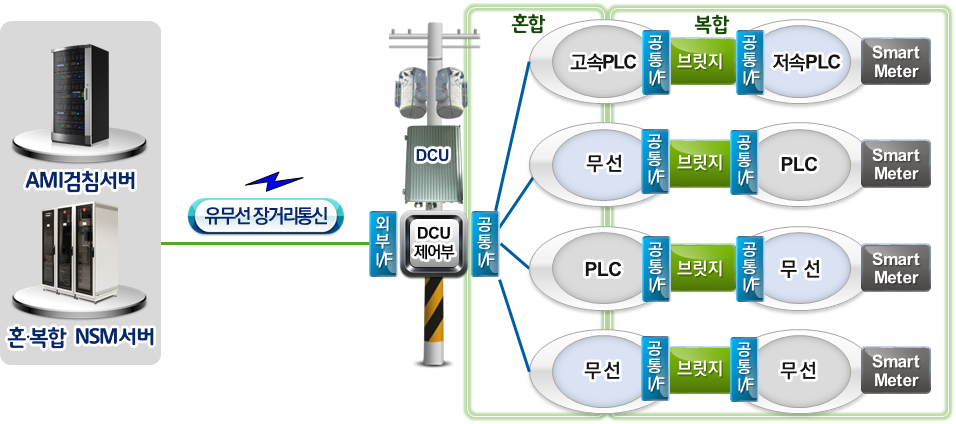 통신환경이 열악한 지역의 검침데이터를 수집하기 위해 유무선 브릿지와 통신한다. DCU는 2개의 공통 통신인터페이스를 가지고 있으며 이종의 통신망을