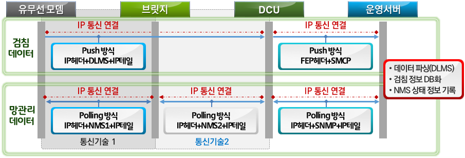 통해 검침데이터 수집이 가능하다. 유무선 브릿지는 유무선 검침모뎀과 통신하며 이종 네트워크 연계 및 검침데이터 중계 기능을 한다. 또한, 유무선 검침모뎀은