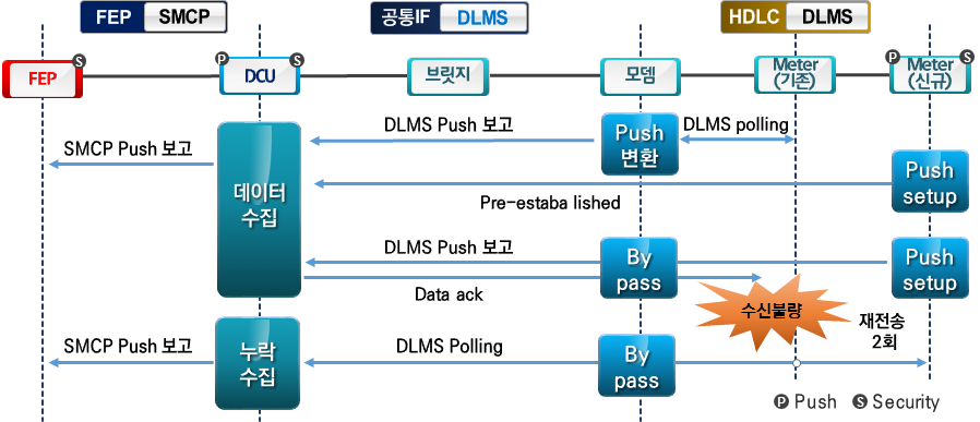 Metering Control Protocol (SMCP) push(11)와 전력량계 국제 표준 통신 프로토콜인 DLMS push 방식이 있다. DLMS push 방식은 실시간 데이터 전송은 가능하나 Push 패킷이 랜덤하게