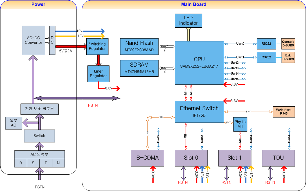 그림 5은 혼복합 DCU의 블록도로 응용 소프트웨어 및 커널이 동작하는 64Mbyte SDRAM, 부트로더와 커널 이미지 및 검침데이터를 저장하는 NAND