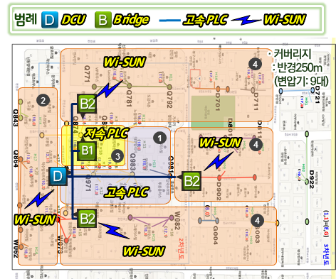 통신하는 브릿지이고, B2는 DCU와 고속 PLC로 통신하고, 스마트미터와 WiSUN으로 통신하는 브릿지이다. 1번과 2번 지역은 각각 고속PLC와