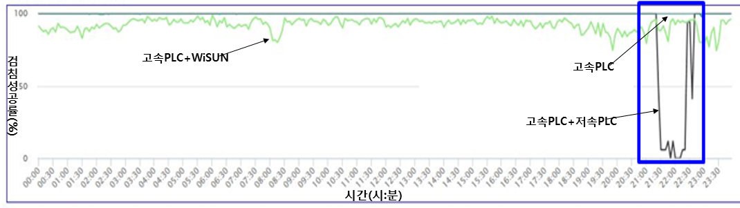 검침성공률이 변화가 크다. 검정색 실선은 고속PLC+저속PLC를 사용하는 3번 지역의 검침성공률을 나타내는데, 저녁시간대에 발생하는 생활 잡음의 영향으로