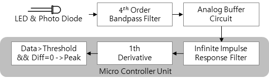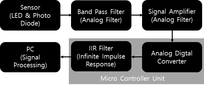 본 연구에서 계측을 위해 설계한 시스템은 그림 1과 같다. 먼저 SPF7070(LED & Photo Diode Module)에서 Raw Data를 계측한다. Raw Data 중 원하는 PPG 신호를