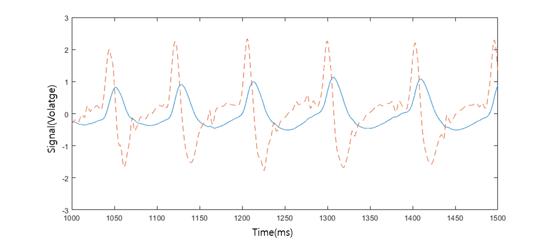 그림 13에서 제시하는 빨간 선 그래프는 IIR Data를 Eq.(1)에 따라서 1차 미분하여 출력한 Raw VPG 그래프이며 비교를 위해 IIR Data를 파란선 그래프로 표시하였다. 그러나 Raw VPG Data에서