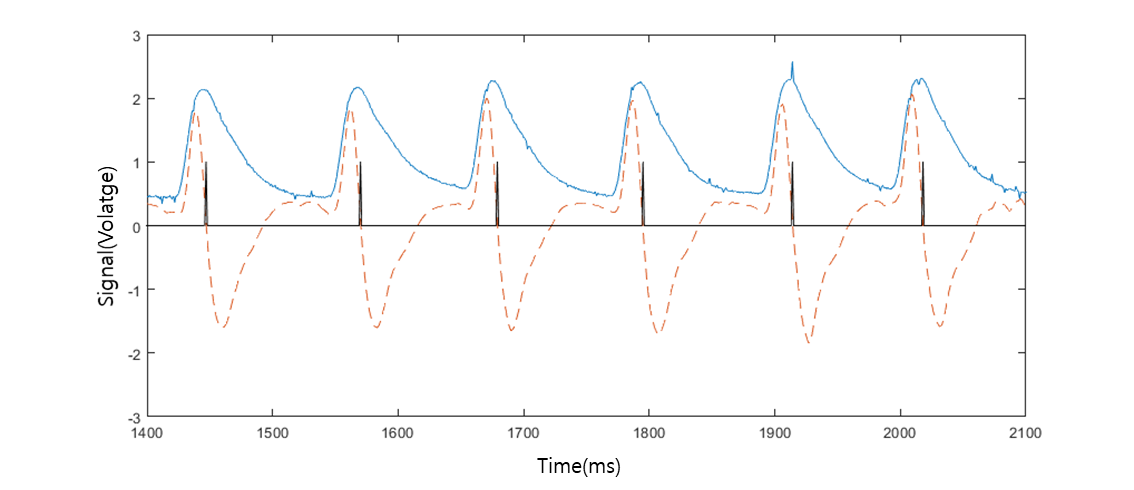 그림 15에서 제시하는 그래프는 Raw Data, Smooth VPG Data와 함께 피크 검출 알고리즘을 적용하여 Peak 점을 검출한 그래프를 표시하였다.