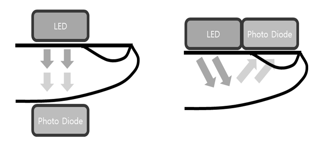 측정 방식에는 투과와 반사 두 가지 방식이 존재하며 투과방식의 경우 그림 2와 같이 발광부와 수광부가 조직을 사이에 두고 반대편에 위치하며 발광부에서 나오는 빛이 신체 조직을 투과한 후 수광부에 흡수되는 빛의 양을 측정하는