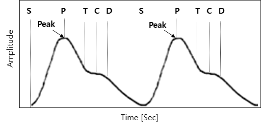 일반적인 PPG 파형은 그림 3과 같으며 심방의 수축에 따라 S 점을 시작으로 하여 최대 수축 점에서 P 파형이 나타난 뒤 이완에 따라 T, C, D 점을 확인할 수 있다. 이때