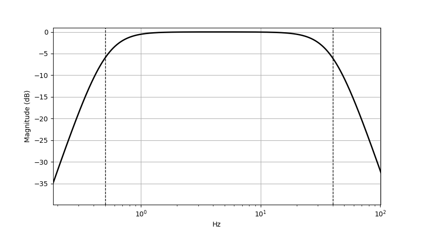 설정한 Band pass Filter의 대역대는 0.3 ~ 40Hz로 설정하였으며 일차적으로 0.3Hz 이하 대역의 잡음을 제거하는 LPF를 거친
