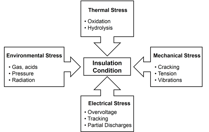 절연재료의 열화 요인은 크게 열적, 전기적, 환경적, 기계적(TEEM, Thermal, Electrical, Environmental and Mechanical)