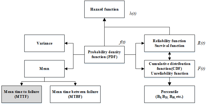 등이 사용된다. MTTF는 수리 불가능한 제품의 고장이 발생할 때까지의 평균 시간으로 정의되며, MTBF는 수리 가능한 제품의 고장 간 평균 시간으로