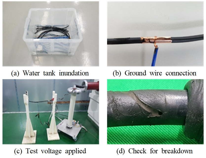 그럼 3과 같이 16 시간 수조 침수 및 중간점 접지선 연결 등 시료 전처리 후 AC 전압을 동일 속도로 인가하여 파괴 시점의 전압을 측정하였다.