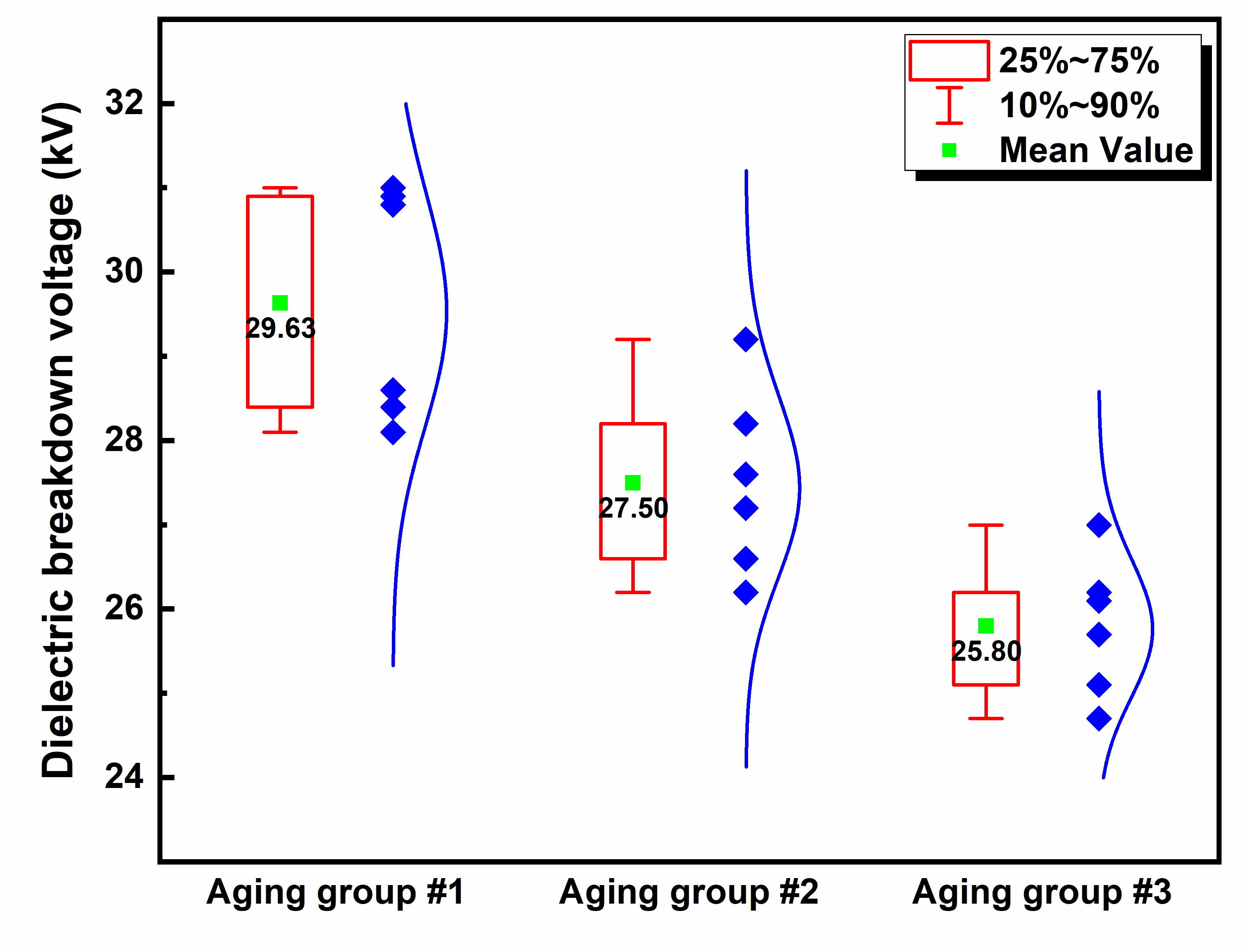 Fig. 4. Distribution plot of dielectric breakdown voltage by aging group of IV wires