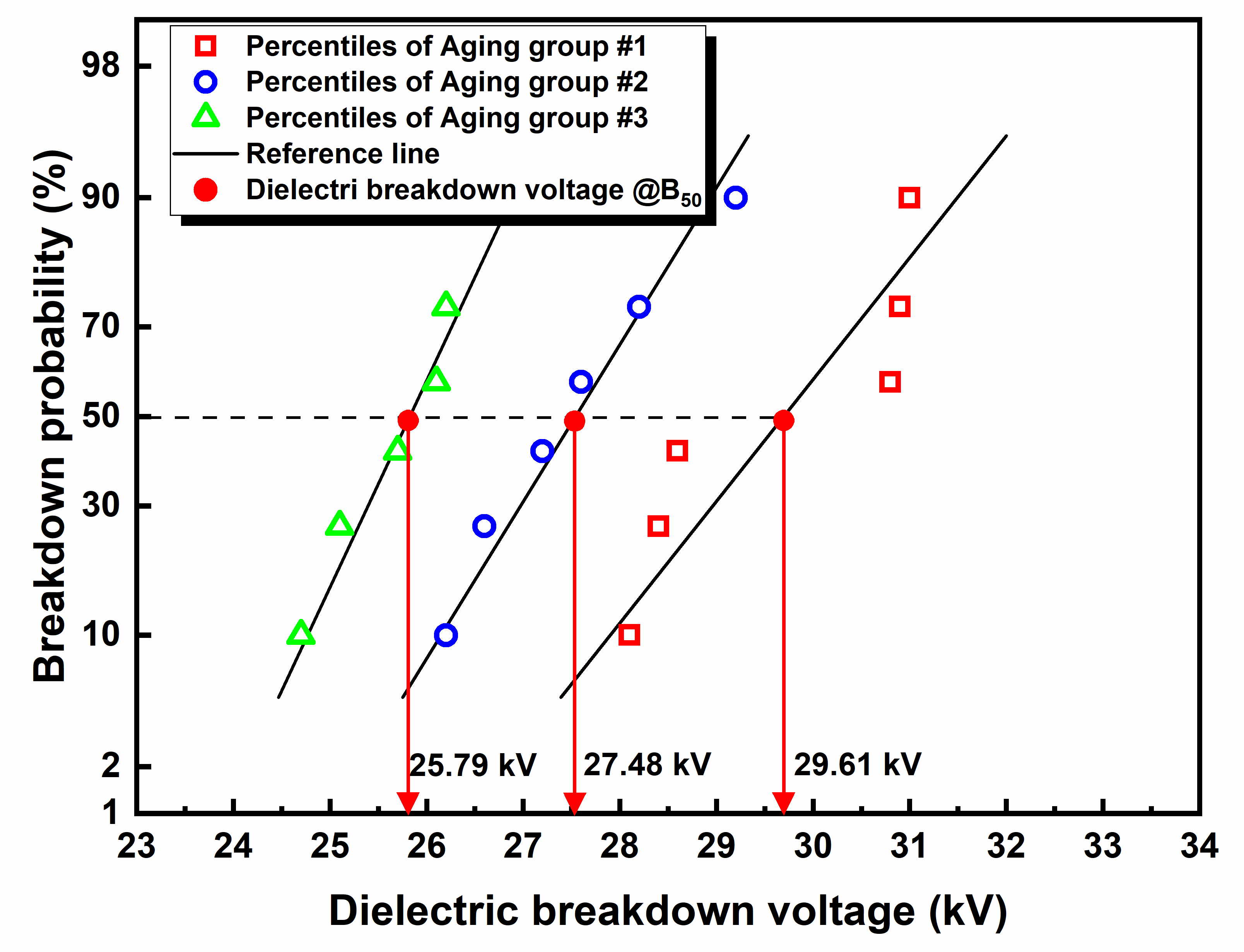 이는 백 분위수로 표현된 고장 데이터가 기준선에 가까울수록 수명분배에 적합하다는 것을 의미한다. 그림 5에서 빨간색 점은 수명그룹별로 고장률 50 %에 대응되는 절연파괴전압을 표시한다.