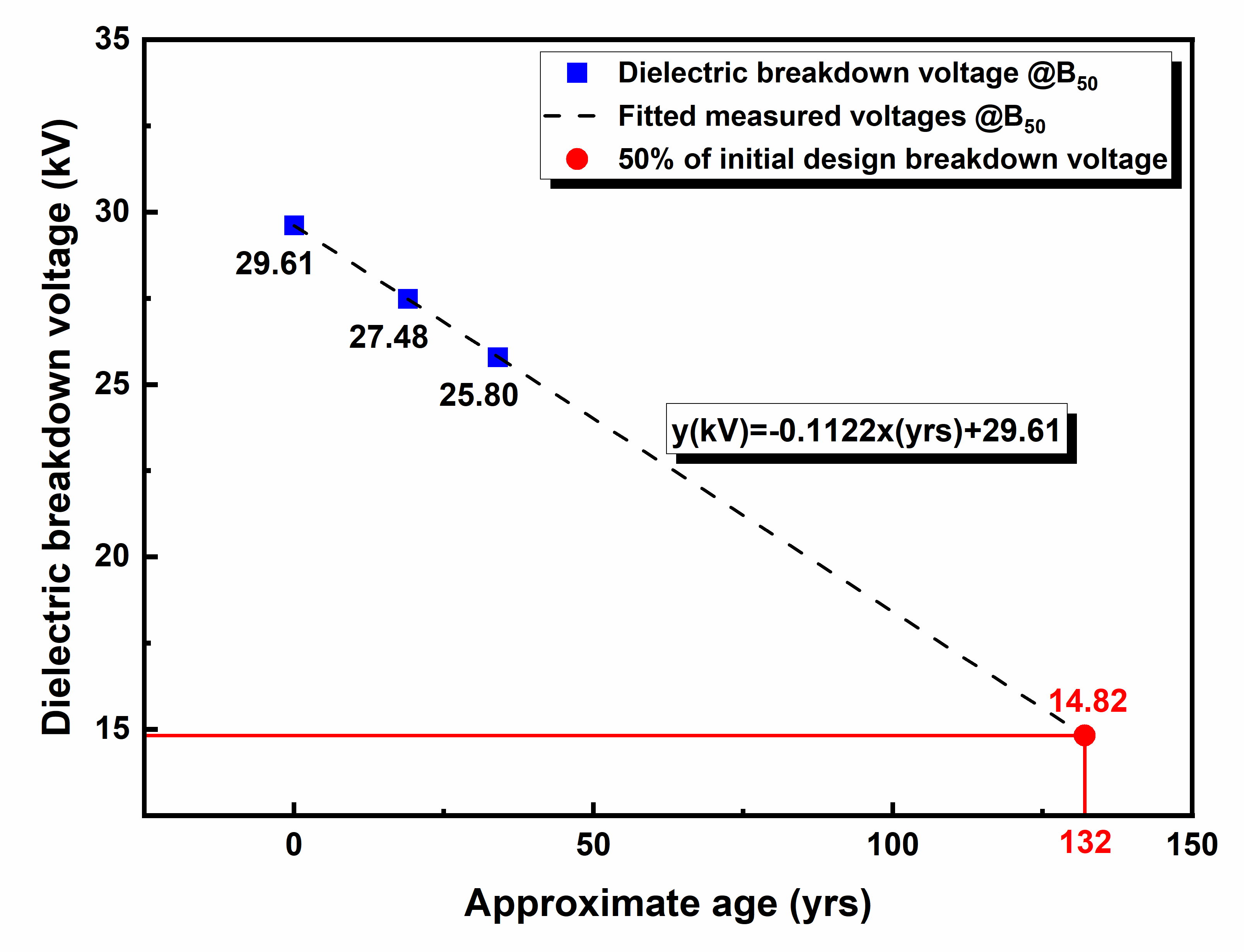 초기 설계파괴전압의 50 %를 가정한다면 예상 평가수명은 132년으로 빨간색 점으로 표시된다.