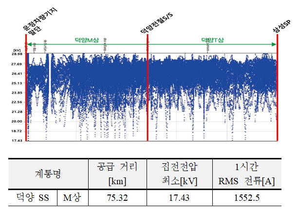 중원 전철변전소의 T상 전압변동이 약 3[kV]로 나타나는 것을 알 수 있다. 즉, 덕양 T상 구간(덕양 SS ~ 삼성SP)이 상대적으로 다른 구간(삼성SP