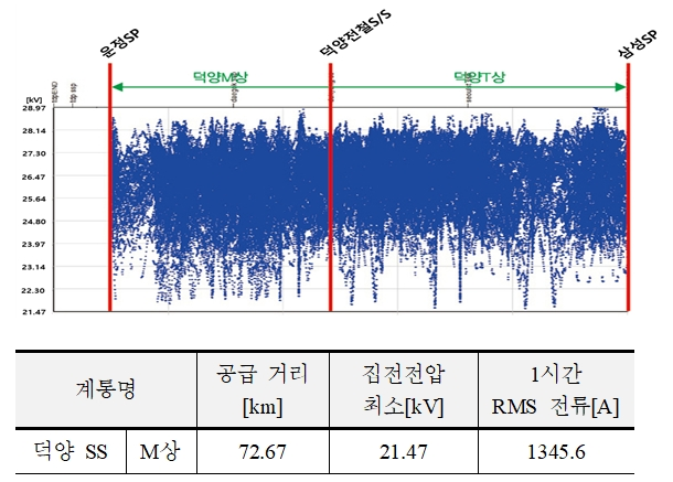 덕양 전철변전소 정상급전시 부하용량 및 전차선 최소전압을 만족하지만, 고양차량기지 전철변전소의 장애로 덕양 전철변전소에서 연장급전 시 집전전압 최소값은
