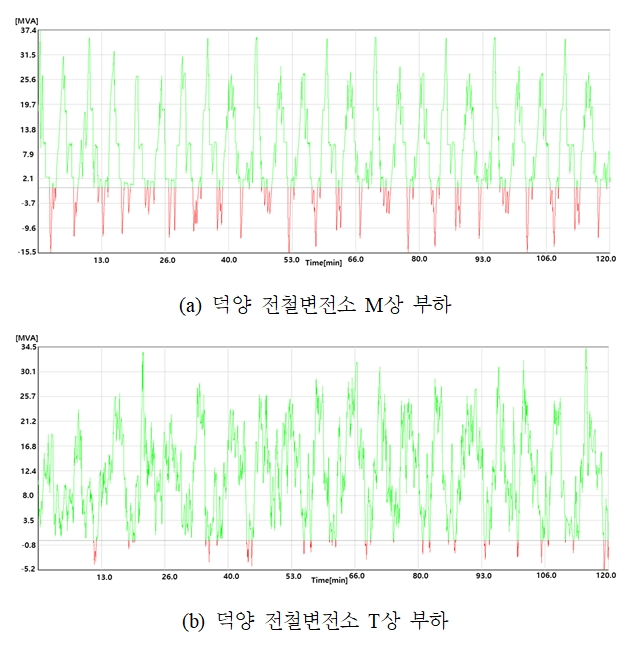 한전계통 3상을 공급받아 스코트변압기에서 2상으로 변환하여 정상급전 시 차량 운행시격에 따른 덕양 전철변전소 M상 및 T상 부하변화, 중원 전철변전소의