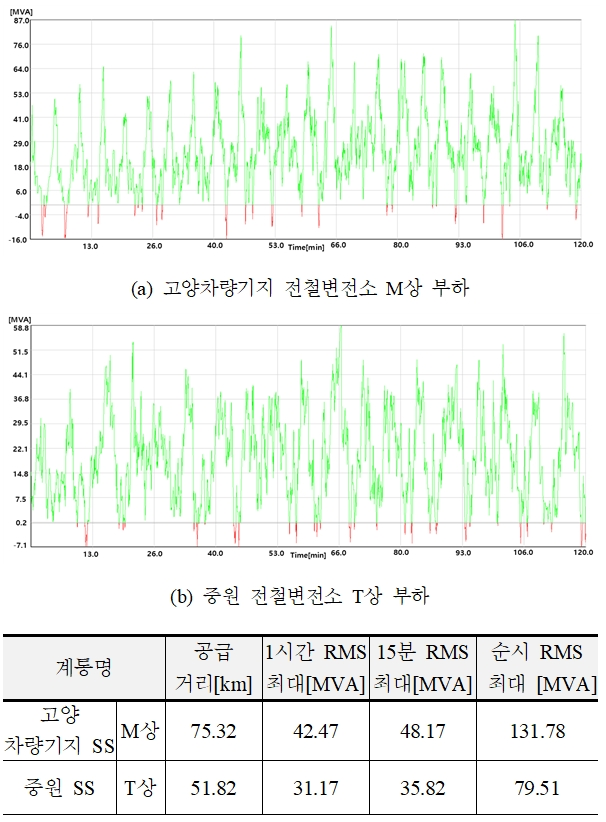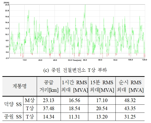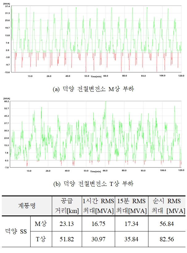 그림 3에서 덕양 전철변전소에 M상이 공급하는 급전 공급거리에 비하여 T상이 크다. 따라서 부하에 공급되는 1시간 및 15분 RMS 최대용량은 M상에 비해