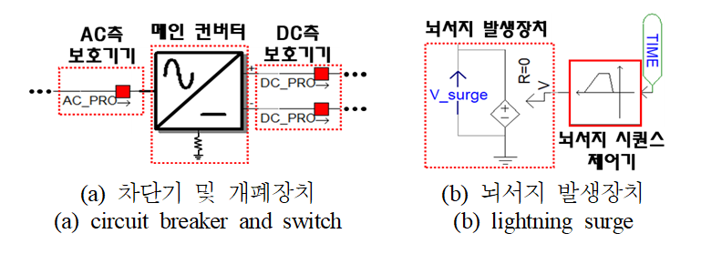 (3) PSCAD/EMTDC 모델링과 전기적 위해요인 평가시험장치의 운용특성에 의하면, AC 및 DC 측 보호기기의 차단 동작에 의한 개폐서지는 각각