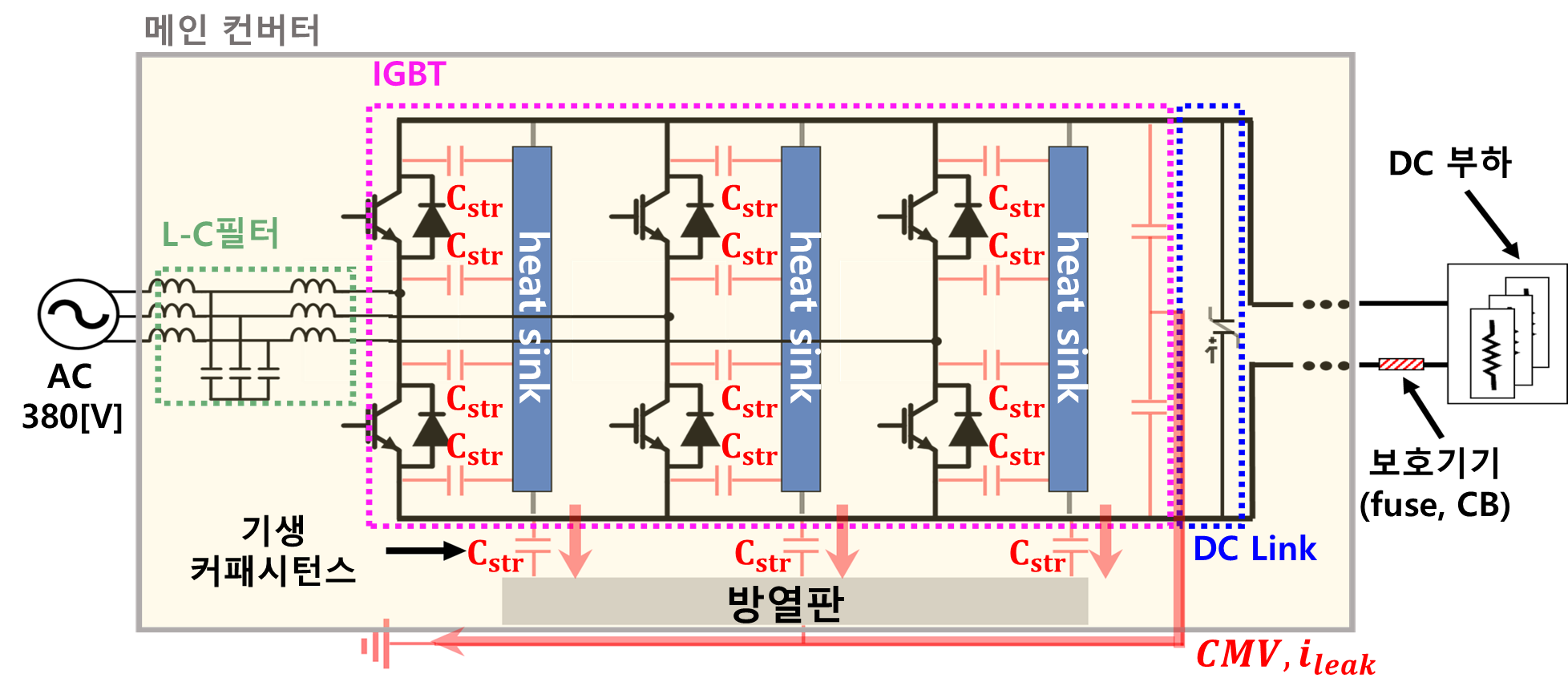 $d$ : IGBT 모듈 밑면과 방열판 사이의 거리, $i_{leak,\: IGBT}$: IGBT 스위칭 동작에 의한 누설전류, $v$: 스위칭 전압,