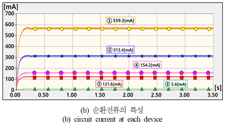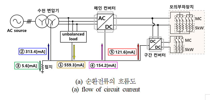 불평형 부하에 의한 순환전류($I_{unbal}$)는 그림 3과 같이, 대부분의 전류($I_{trans}$)가 변압기의 중성선을 통하여 흐르게 되지만, 일부 전류는 접지선을 따라 DC 측의 메인 컨버터와 구간