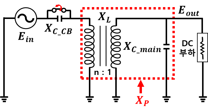 $ : 출력전압[V], $n$ : 권수비, $X_{P}$ : 변압기와 메인 컨버터의 병렬 등가 임피던스[Ω], $X_{CB}