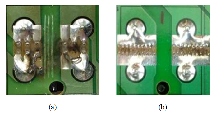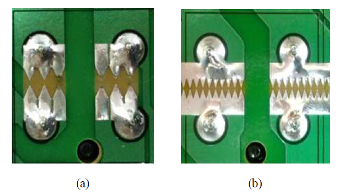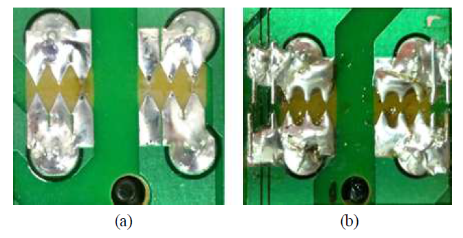๊ทธ๋ฆผ 25. ๊ธฐ์กด ๋ฐ ์ ์ํ spark-gap์ PCB ํจํด ์คํ ๊ฒฐ๊ณผ; (a) ๊ธฐ์กด์ spark-gap, (b) ์ ์ํ spark-gap