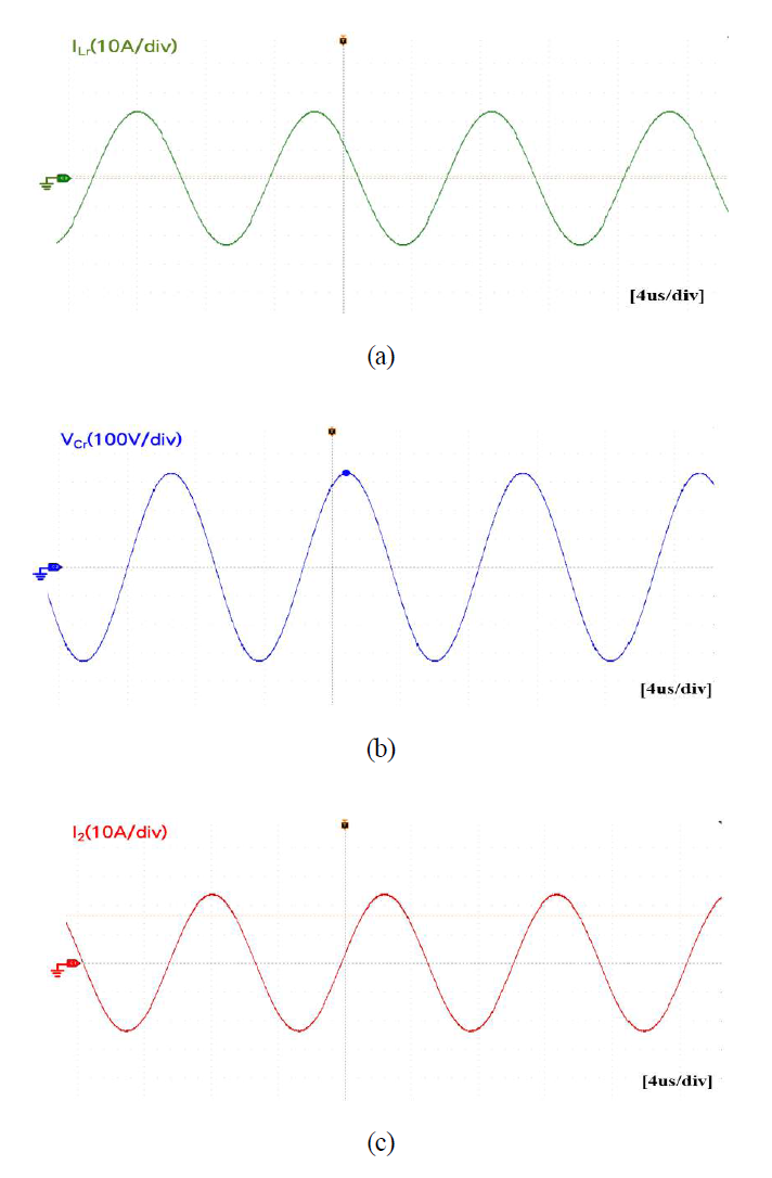 그림 6은 그림 1의 Full-bridge LLC 공진형 컨버터가 공진 주파수와 같은 지점에서 스위칭 주파수로 동작할 경우, 전류 파형이다. 파형을 통해 컨버터의 동작