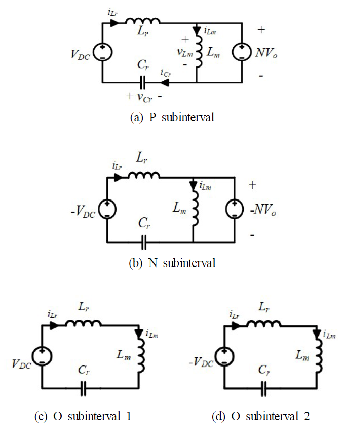 그림 3은 TDA 기반 subinterval에 따른 Full-bridge LLC 공진형 컨버터의 등가 회로이다. P subinterval은 자화 인덕터 양단의