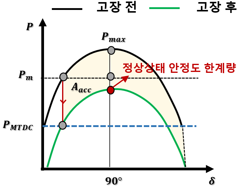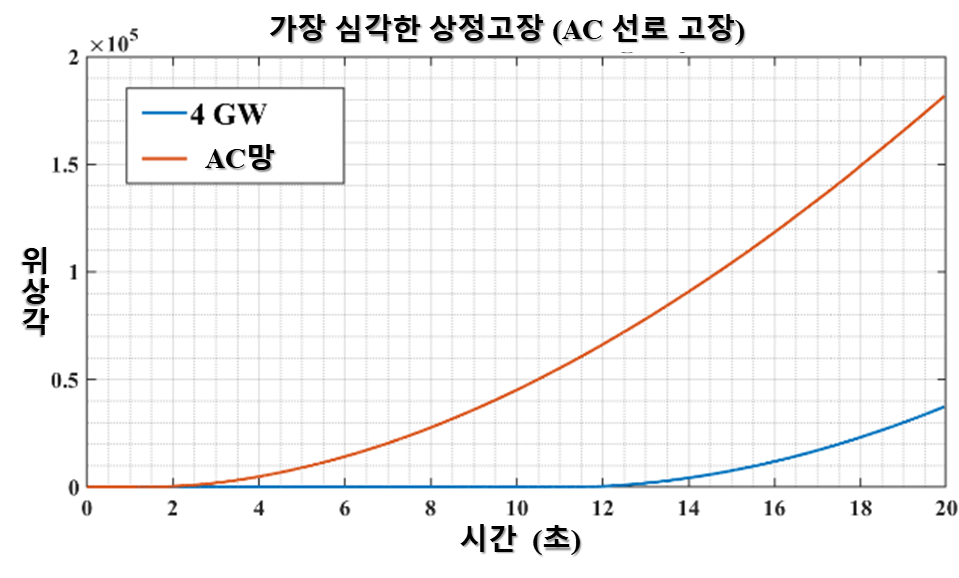 나타내며, 고장 시 회전자 가속영역이 감속영역의 면적을 초과할 시, 동기발전기의 회전자가 빠르게 가속하여 탈조될 수 있다. 위 그림 6, 7에서 볼 수 있듯이 같은 계통 운전점에서 AC 선로 고장에 따른 회전자 가속 영역의 면적이 줄어들어 과도안정도가 향상됨을 확인할 수 있다. 이는