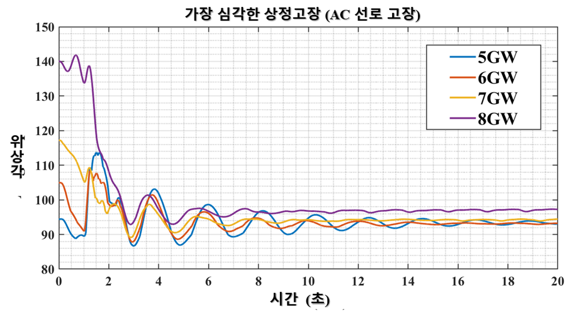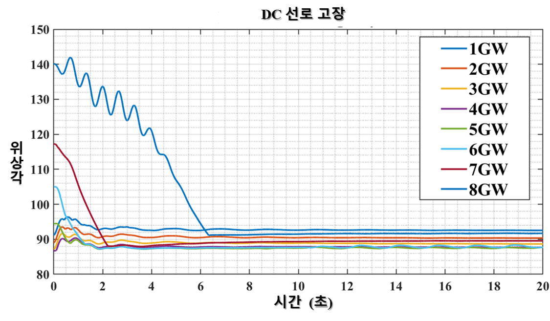이해할 수 있다. 즉, AC선로 고장 측면과는 반대로 DC선로 고장 측면에서는 DC 선로 조류가 작을수록 과도안정도 확보에 있어 유리함을 의미한다.