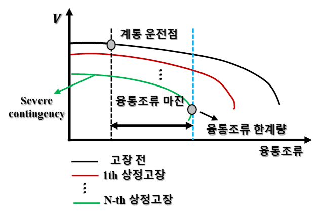 선정한다. 그림 3은 고장 전과 상정고장별 PV 커브 개념도를 나타낸 그림으로, 고장 이후 융통조류 한계량이 낮아지는 것을 알 수 있다. 이때, 융통조류 한계량이 가장