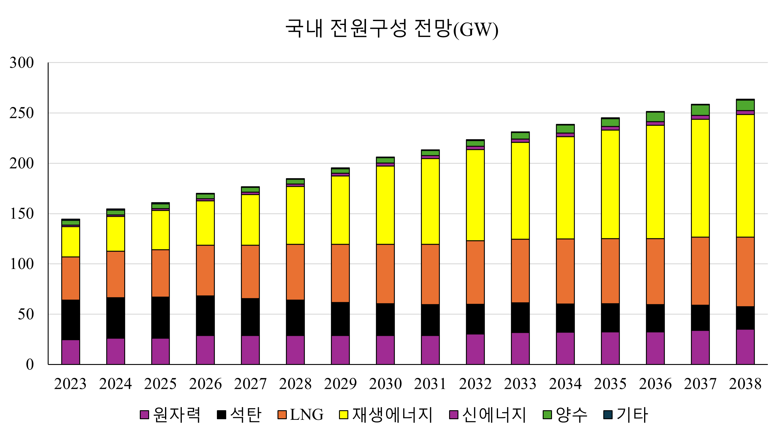 37.8%를 차지하고 ’38년엔 121.9GW로 45.5%를 차지할 것으로 전망된다. 발전량의 측면에선 ‘30년엔 120.9 TWh로 발전량 비중의