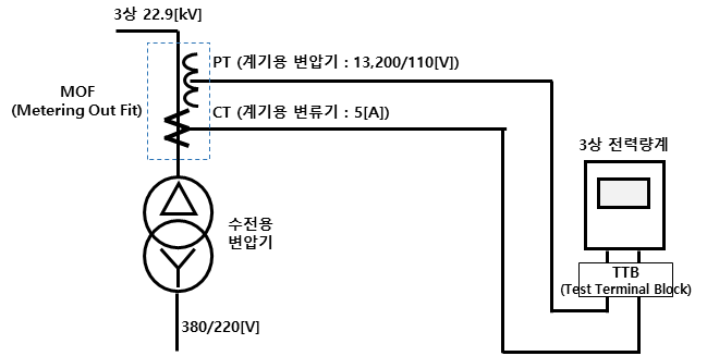 ๋ฃ์ด ์ฌ์ฉํ๋ 22.9 [kV]๊ธ MOF (Metering Out Fit)์ ํน๊ณ ์ 1์ฐจ์ธก๊ณผ ์ ์ 2์ฐจ์ธก์ ๋น๊ต CT๋ฅผ ๊ฐ๊ฐ ์ค์นํ์ฌ ์ ๋ฅ๋ฅผ ๋น๊ตํ์ฌ