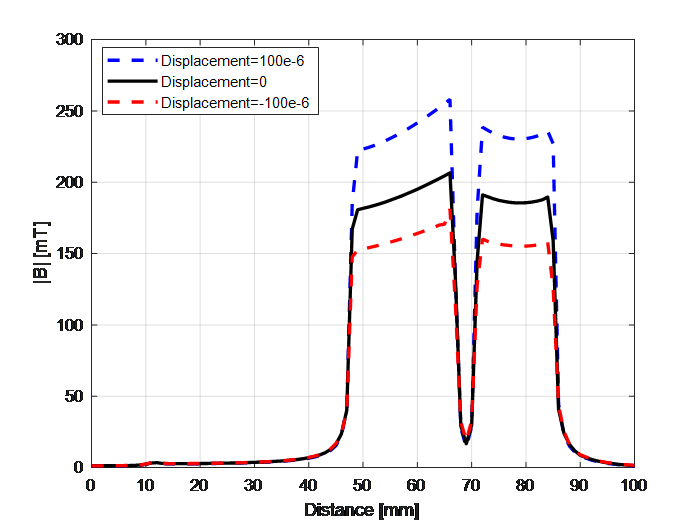 그림 3은 공극의 변위가 +100 μm, 0 mm, -100 μm 일 때, 공극 중앙에서의 자속밀도의 크기(절댓값)를 나타낸다. 그림에서 x-축은 회전자