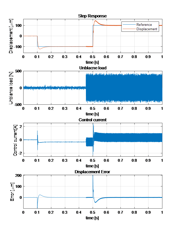 PID제어에 의한 계단 응답에서 입력 지령 대비 약 47%의 오버슈트가 발생하고 있으며, 이는 축방향 자기베어링 변위의 한계인 터치베어링(touch