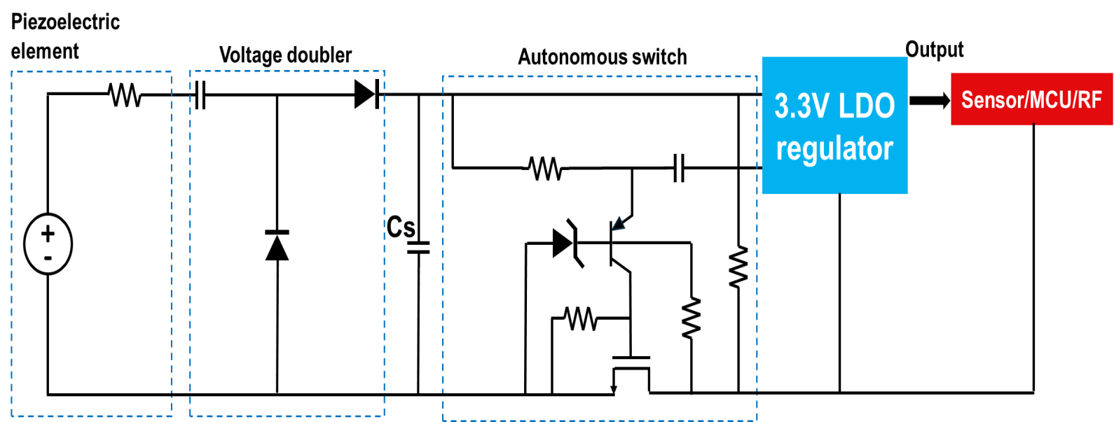있다. Voltage doubler는 압전 소자 출력 전압의 peak-to-peak 전압이 커패시터 (Cs)에 인가 될 수 있어 bridge 회로보다