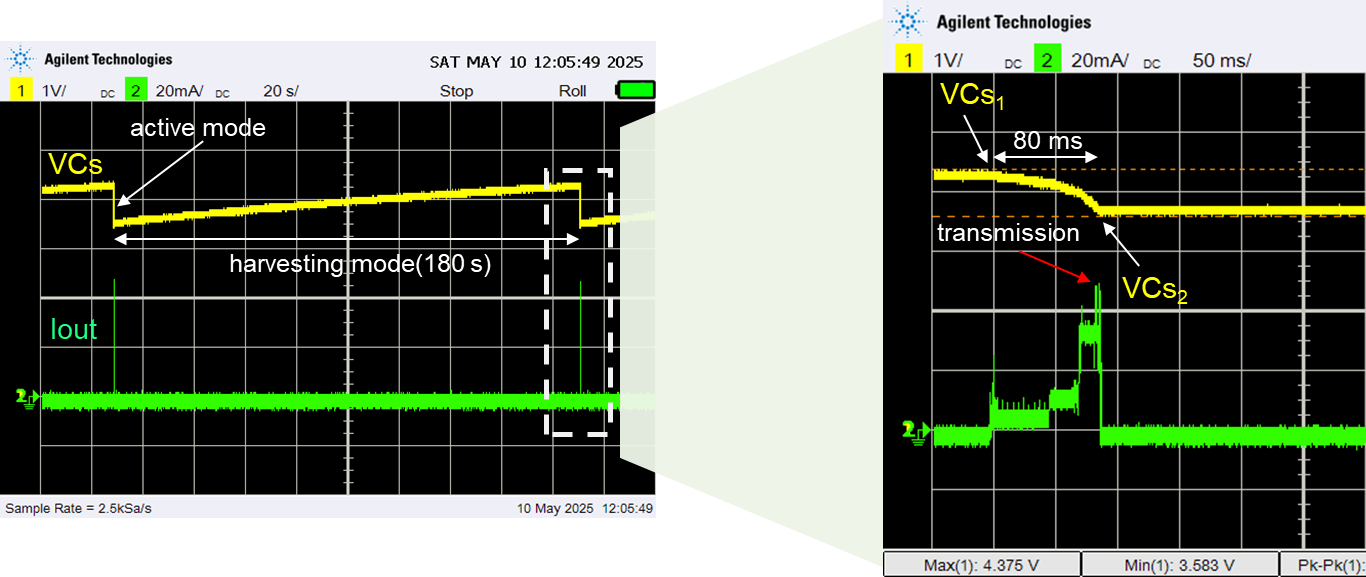 이로 인해 커패시터는 레귤레이터에 연결되고 3.3 V DC 전원이 출력되어 무선 센싱 회로에 전원이 공급되는 active mode 가 시작된다. 이