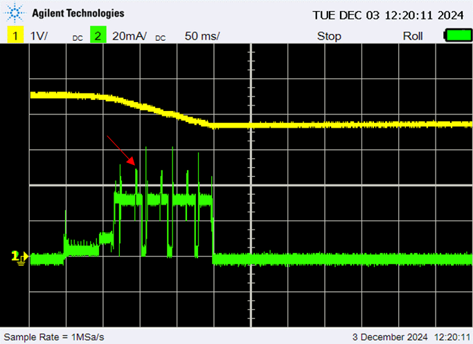 전력은 점차 소모되어 커패시터 전압이 감소하는 것을 확인할 수 있다. 커패시터 전압이 3.5 V 미만으로 감소하게 되면 BJT-MOSFET 래치가