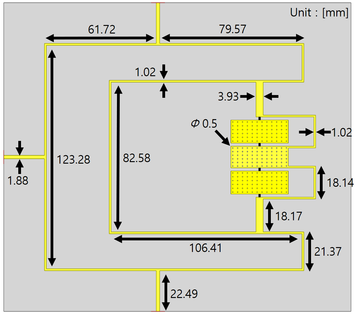 Structure Simulator)를 통해 설계하였으며, 기판은 유전율이 2.97인 Taconic RF-35를 사용하였다. 해당 기판에 대한 명세는