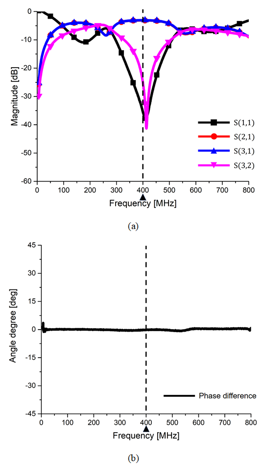Fig. 15. Measurement results of Fig. 14 (a) S-parameter (b) Phase difference between output ports