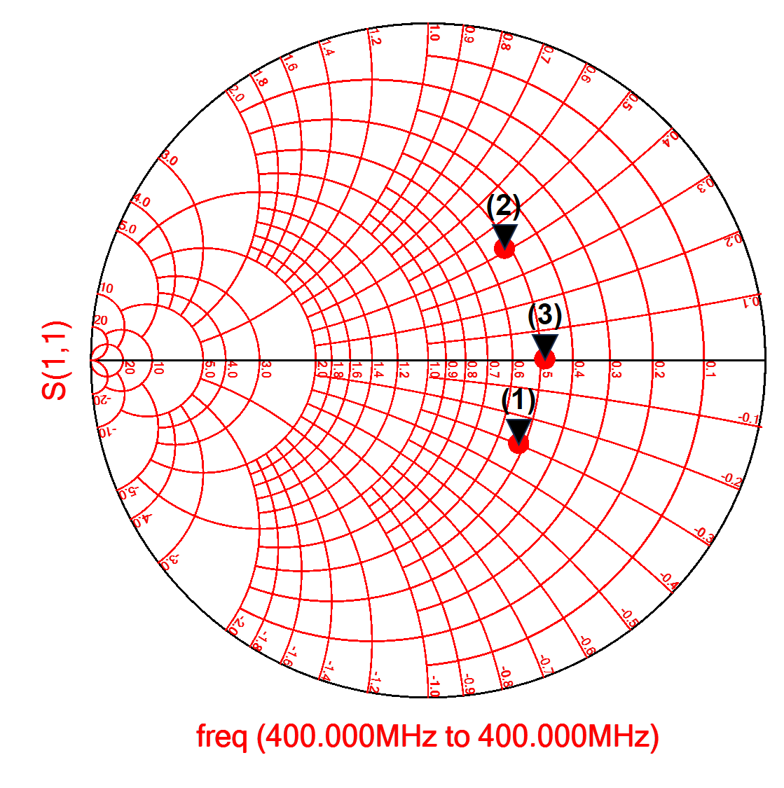 주파수 400[MHz]에서 이상적인 저항의 경우, 그림 3(a)에서와 같이 2+j0[Ω]의 값을 가진다. 반면에, 고전력 저항의 경우, 그림 3(b)에서와 같이 1.456–j0.828[Ω]의 값을 가진다. 이를 통해 고전력 저항은 이상적인 저항과 같이 동작하지 않고 기생 성분의 영향을 받아 복합