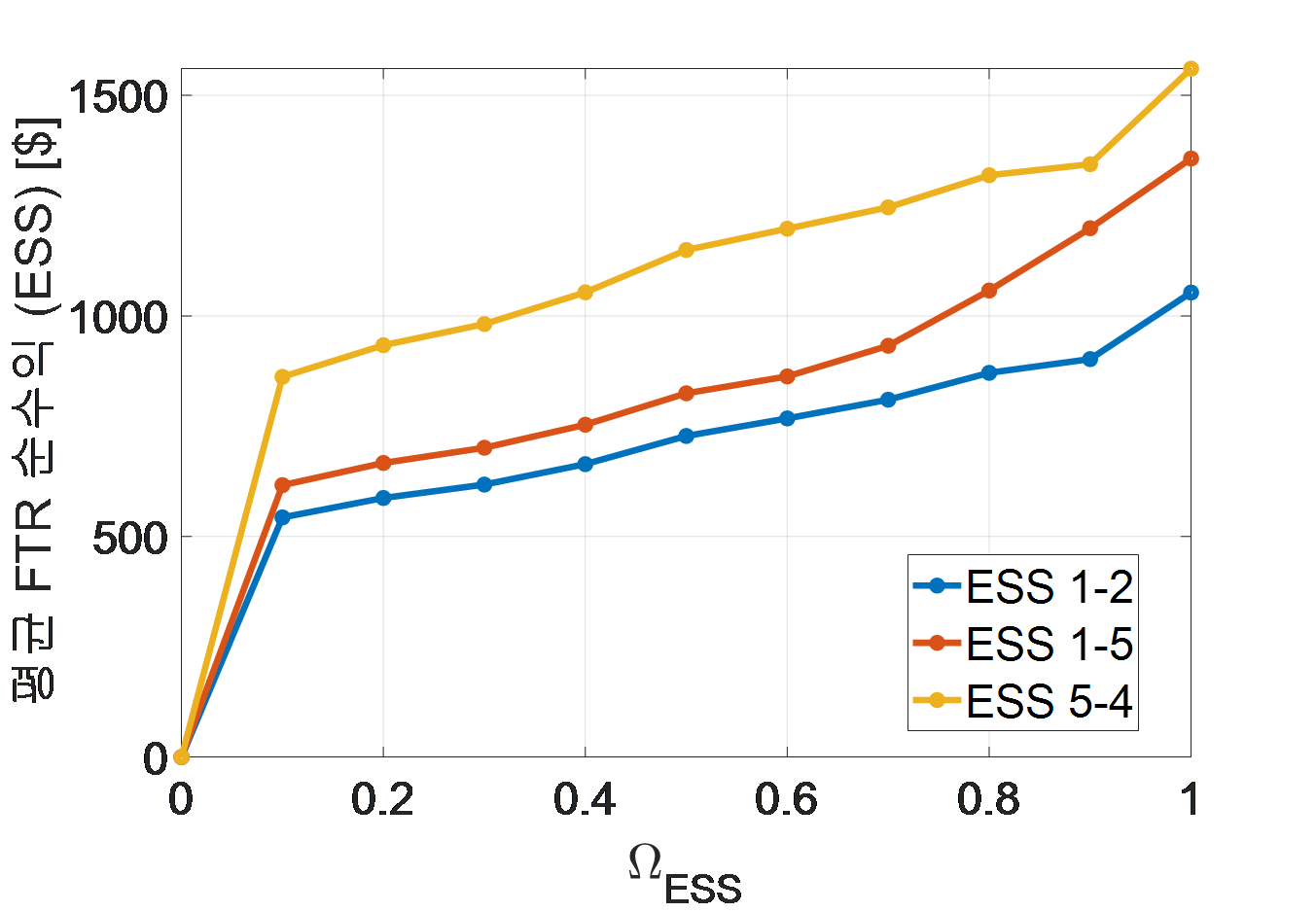 그림 8은 ESS 운영 강도 계수 ($Ω_{ess}$)에 따른 FTR 평균 수익 변화를 나타낸다. $Ω_{ess}$가 커질수록 평균 FTR 순수익은 증가 하는 추세를 보인다. 이는 ESS가 T1 시장에 더 적극적으로 개입하여 LMP 격차에 영향을 미칠수록 FTR을 통한 평균적인 수익 기회가 커짐을 나타낸다. 이때 ESS가 모선 5와 4에 위치할 때 가장 높은 평균 FTR 순수익을 보였으며, 다음으로 모선 1과 5 사이, 모선 1과 2 사이 순으로 나타났다.