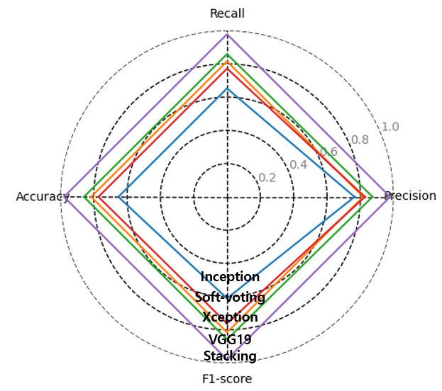 그림 9는 표 1을 기반으로 시각화한 결과로, InceptionV3, Xception, VGG19와 소프트 보팅, 스태킹 기법 간 성능 차이를 한눈에 비교할 수 있도록